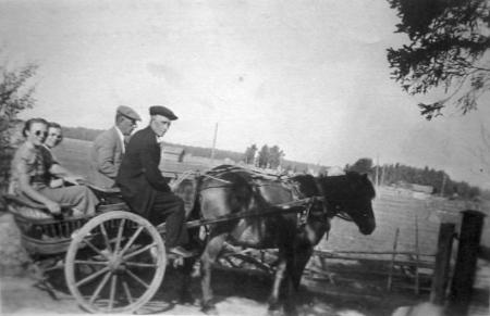 Bröderna Alfred (Hansos Alfred) (t.h.) (1871-1954) med hustrun Maria f. Kalfholm (1867-1958) och August Åkerman 'Hansos' (1886-) med hustrun Dina Maria f. Bengtas, på besök i hemlandet. Bilden tagen i samband med Augusts besök från Amerika på 1930-talet