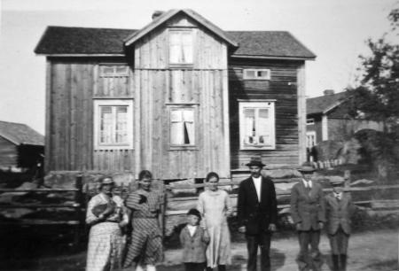 "Binnis", från vänster: Sylvia Anna Cecilia (1906-1979), Helen Viola (1908-1969), Axel Wilhelm (1923-2003) , Tilda (1883-1941), Kristian (1881-1962), Valdor Harald (1916-1982), Walfrid Levi* (1918-1977). Elsie o Runar fattas. Sylvia var gift med Gunnar Glasberg som omkom i granatkastarolyckan i Smedsby där också Elsies man Hugo Lithén omkom. Helen gift med Alfred Gideon* Kalfholm