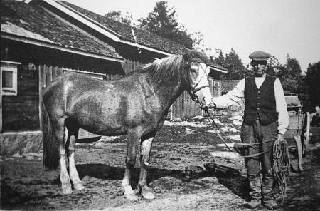 Kristian Hjerpe (1884-1937) med häst och "linjala-kärro" på gården vid Hällgärd i Singsby.