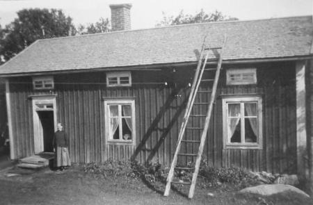 "Kallesas". Maria Sofia Lithén (1856-1935). Stugan belägen söder om Vilhelm Lithéns gård i Mittjels ändan. Ägs idag av Björn Erik Lithén. (Kortet från 1920-talet). Stugan utbyggd i något skede med en "framkammare"