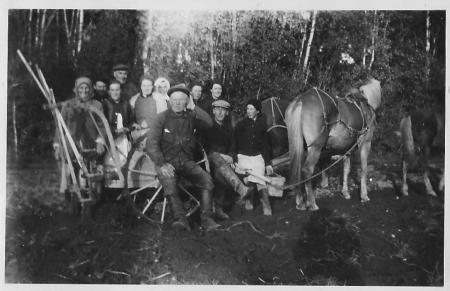 Det nya underverket: Potatisupptagningsmaskinen. "Päronopptagarin" inköptes och togs i bruk hösten 1929 av bolaget Axel Sabel, Edvard Lax och August Ström. På bilden är "bolaget" samlat under en paus vid upptagning hos Stavas hösten 1929.