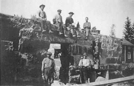 Byggandet av Alfred Järvs stenfähus i början av 1900-talet. Huset byggdes av Karperöbor. Gamla bostadshuset skymtar till höger i bild.