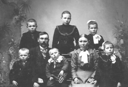 Barnen, övre raden: Eskil Evert (1898-1980), Ester Elisabeth (1894-1965) gift med Kristian Hjerpe från Binnis i hans andra äktenskap, Maria Emilia* (1896-1979) gift med