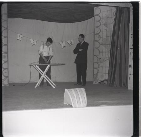 En kulturkritiker hade året innan ondgjort sig över kvaliten på programnumrorna och menat att varannat nummer borde strykas. Därför står nu Hilding Pellas året därpå i revyn "Vi hänger me" och stryker numror. Åskådare: Helmer Lithén.