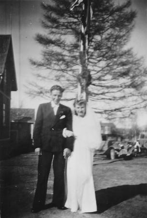 Linda Adele Sofia Rönn (1925-2015) från Singsby, född i Västervik och Sven Gösta* Beijar (1921-?) från Petsmo firar bröllop vid Singsby ungdomslokal 1946 eller -47