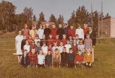 Övre raden: Virve Karlsson, Marita Bäck, Lisen Syring, Thommy Klemets, Torolf Håkans, Jan-Ole Sand, Åke Småros, Leif Norrgård, Bernt Sundvik, Hasse Fransholm, läraren Alf Svedlin.