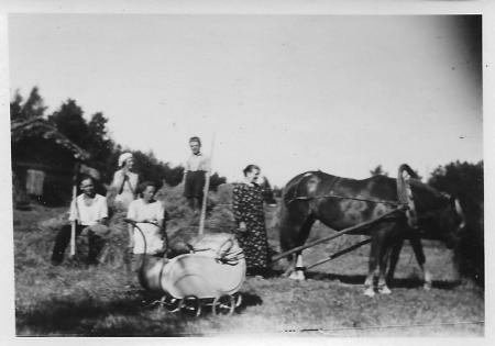 Vid barnvagnen: Adele Lund, Boris Lithén i vagnen. Taget där Boris senare byggde sitt hus.
