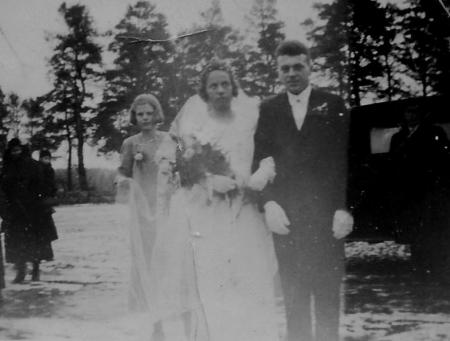 Hugo Alfred Lund (1912-1971(, född i Petsmo och Hjördis Adele* Hjerpe (1909-1992) gifter sig 1935. Brudtärna: Olida Emilia Ingeborg* Hjerpe (1920-2007)