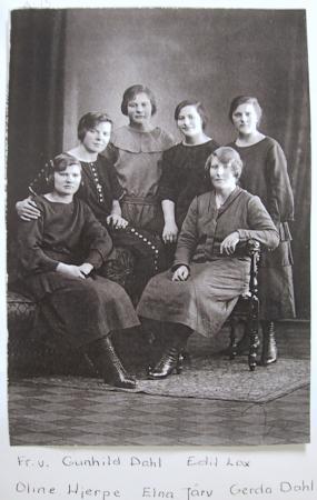 Från vänster: Lydia Gunhild* Dahl (1909-1982), gift Håkans, Edith Sofia Lax (1903-1994), gift Strömberg, Anna Oline* Hjerpe (1909-1989), gift Hjerpe, Elna Sofia Järv (1906-1980), Gerda Mathilda Dahl (1905-1990), gift Dahl.