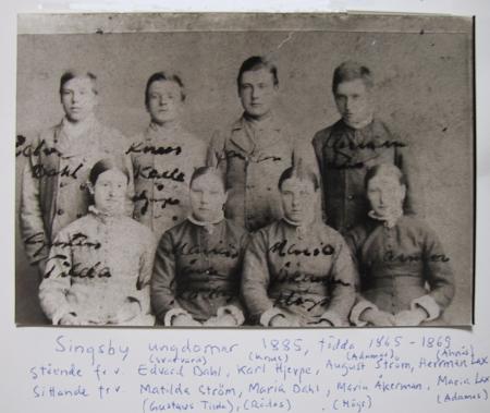 Sittande från vänster: Mathilda Ström (1866-1933), gift Lax, Maria Dahl (1867-1927), gift Järv, Maria Kalfholm (1867-1958), gift Åkerman, Maria Lax "Adamas Mari" (1865-1944), gift Ström.