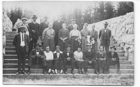 Sittande: Einar Ström, Aina Mattas från Jungsund, g. Ström, Signe Lithén, g. Ingman, John Ingman från Jungsund, Elisabeth "Betta" Klockars från Solf, gift Sabel, Uno Sabel, Signe Sabel, g. Norrgård, Frans Norrgård från Böle. Mannen längst till vänster: Johannes Järv från Karperö.