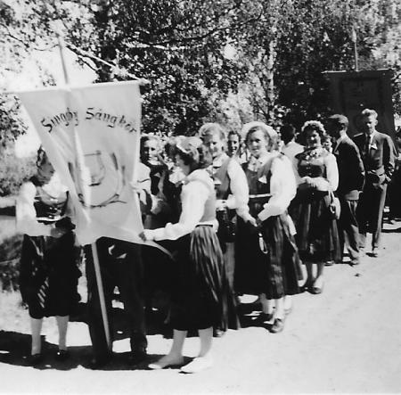 Sångkören klar för parad vid sångfest. I raden syns bl.a. Inga Lithén (Håkans), Ines Lithén, Bengt Sabel....