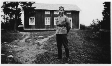 Gösta Lithén hemma på permission från armén står framför hemgården.