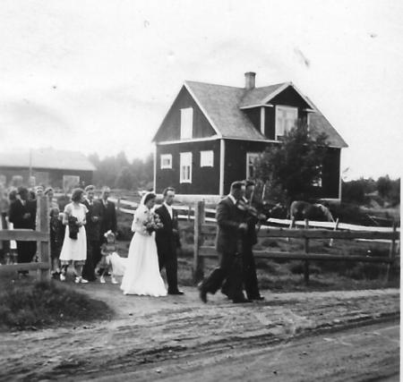 Brudfölje från Joelas. Gunborg Sofia Dahl (1929-1923) gifter sig 1952 med Karl-Johan Lithén (1926-1963). Brudnäbb troligen Doris Dahl. Spelmän Elis Dahl och Ernfrid Lax..