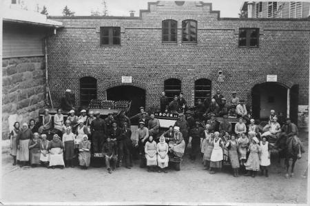 Anställda vid Bocks bryggeri. Andra från vänster på motorhuven på bilen längst till vänster: Aili Hjerpe, gift Åkerman.