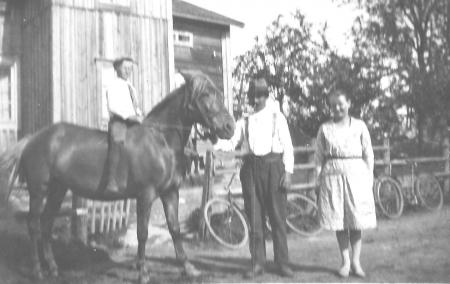 Binnis Kristian Hjerpe (1881-1962) och första hustrun Anna Mathilda* Järf (1883-1941) från Karperö, framför huset vid Maravägen. En av sönerna på hästryggen.