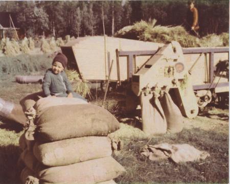 Mikael Hjerpe på sädessäckarna, mamma Kristina på traktorlasset.