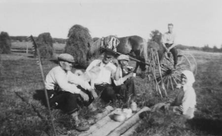 Lenis-Erik Storm vid hunden, närmast kameran hans far Johannes, den andra farbrorn torde vara Johannes bror. Räfsmaskinsföraren okänd. Damen torde vara Eriks mor Erika, född Östergård i Sundom.