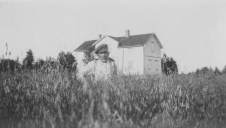 Johannes Storm (1871-1947) från Västervik framför gården som 1925 flyttades från Västerviken till Skildmaren i Singsby (Lenis).
