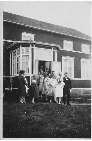 Anni och Evert Bäck träder som nygifta ut ur brudens hem. Husets ingång ännu på sidan mot vägen.