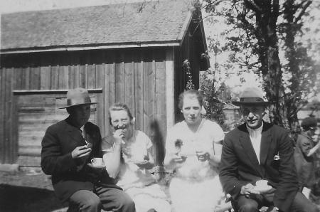 I bakgrunden skymtar ett litet stockhus med valmat tak - detta torde vara Kristian Lax "Stavas Krisjans" smedja som bestod av nedre delen av väderkvarnen som stått på Knusbacken.
