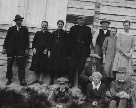 Karl August* "Stavas August" Lax (1882-1942) och hustrun Hilda Sofia Nabb (1891-1977), Maria Mathilda* Knip (1878-1961) och hennes man Edvard "Stavas Edvard" Lax (1866-1943), 2 okända, Anni Mathilda Lax (1905-1994) gift Bäck.