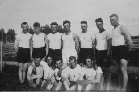Tredje uppe från vänster: Lenis-Erik Storm, andra från höger: Runar Pada från Karperö. I mitten med vita shorts: Alfred L Beijar från Karperö.
