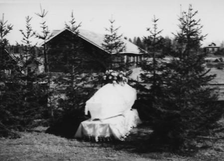 En kista med den avlidne i väntan på avfärd till gravgården. Osäkert vem den avlidne var. Möjligen Edvard Lax (Stavas Edvard) som avled 1943.