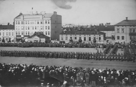 Jägarparad på salutorget i Vasa förmodligen sommaren 1918. Lite till vänster det så kallade våghuset där man kunde väga sina varor och kontrollera sina egna vikter. Verksamheten flyttades 1924 till brandkårshuset.