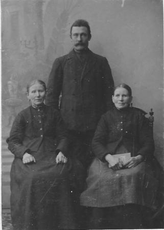 Till höger Anna Lisa Lax (Alnäs-Lis) (1837-1913), gift Kloo (Åkerman). Till vänster dottern Anna Karolina (1863-1924) gift med Karl Backholm, (stående) (1865-1916) från Sundom. Var bönder på Åkerman hemman. Flyttade 1902 till Sundom och blev bönder på Backholm hemman.