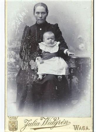 Maria Eurlin (1877-1951) från Koskö. Gift 1 med Johannes Lax (1876-1901), i famnen dottern Anna Evelina (1901-1902). Maria gift 2 med Johannes Smeds (1880-1947).