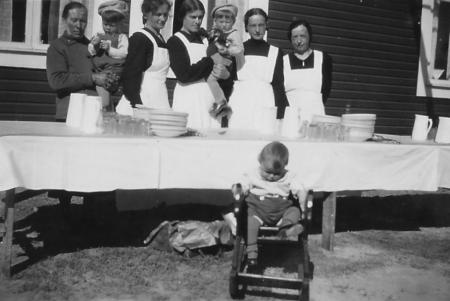 Dukat för matservering vid Oskar Verner Storms begravning i juni 1940. Han var född 1909. Barnen är Harry Valdemar (1934-), Henrik Oskar (1935-) och Bruno Severin (1939-). Längst till höger: Elna Järv. Längst till vänster: Maria Eurlin, gift Smeds.