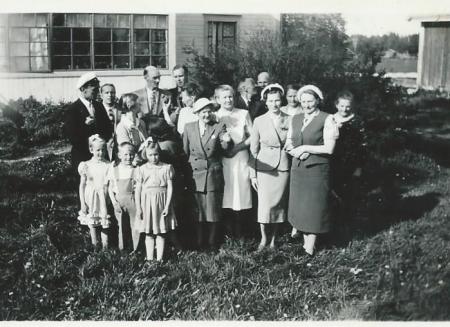 Berits studentfest 1954, Berit född 1934, gift med Professor Alfred Kraus i Tyskland. Männen från vänster: Ture Paro (som då sällskapade med Berit), Kurt Lindqvist, Lennart Hägglund, Tor Hägglund, Snofs Hugo, Marlene Ehnströms far Runar Pada. I mitten: Snoffs Aina, bakom Aina t.v. Marlenes mamma Senny, bakom Aina t.h. Elin Hägglund. Bredvid Berit: barnskollärarinnan Edith Lindqvist. Barn från vänster: Ediths Christina och Curt-Erik. Bakom barnen syns Denise i profil. Längst t.h. Marlene. Mathilda Hägglund står längst till höger. Oklart vem det är som står mellan Berit och Edith.