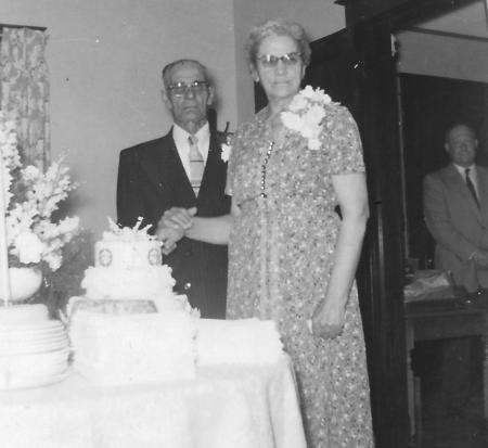 Richard Dahl (1881-1954) och Anna, född Hagström i Sverige, på deras 25-åriga bröllopsdag 1958. I bakgrunden skymtar Richards systerson Herbert Lillund (1904-1995)