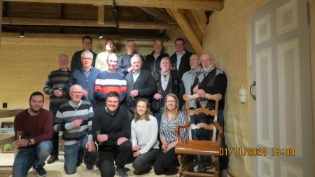 Här har gänget, som förvandlade ett skräputrymme på Singsby ungdomslokals vind till en representativ lokal avsedd att användas som byamuseum, samlats för att fira efter ett med bravur utfört jobb .