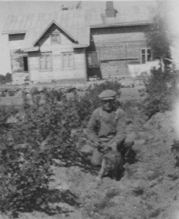 Erik Evald Åkerman (1909-1984) med hund, i trädgården framför hemgården.