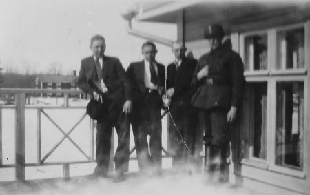 Fyra okända på terrassen vid Hägglunds butik. I bakgrunden syns Anders och Sofia Lunds gård som den såg ut innan branden 1933.