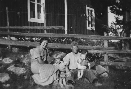Karl Fridolf* Hjerpe (1910-1989) och hustrun Anna Oline* Hjerpe (1909-1989) med barnen Daisy Veneda Margaretha* (1934-2024) och Carl-Einar Alfons (1937-1964) vid Fridolfs syster Agnes och hennes man Elis Dahls hus i Kärre.