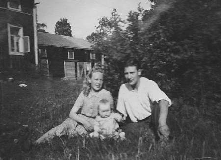 Stig-Erik Ernfrid "Stig" och Gunhild Vilhelmina, f. Örn med dottern Viola Margareta i det gröna vid Adamas. Foto från 1947.