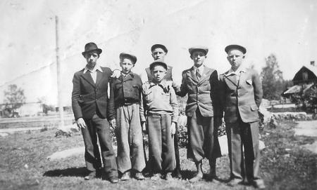 Från vänster: Karl-Johan Lithen (1926-1963), Gunnar August Lax (1928-2004), Gustav Eugen Lithén (1926-1974), Henry Evert Lithén (1931-2016), Helmer Allan Edvard Lithén (1928-2020), Almer Joel Elof Lithén (1928-2021).