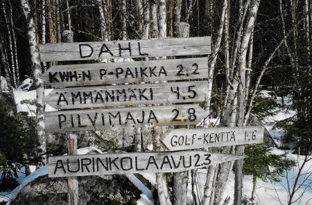 Skyltar invid skidspåret vid Molnträsk där Frans Dahl hade en fäbod.