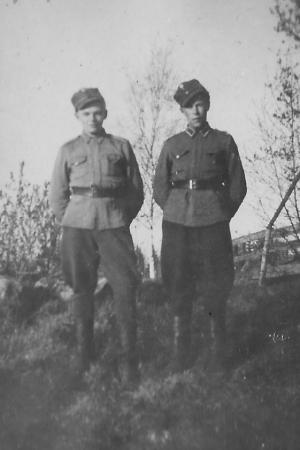 Alvar Edvard Lithén (1925-2025) och Axel Wilhelm Hjerpe (1923-2003). På jordbrukspermission 1944.