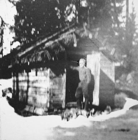 Hugo Dahl i dörren 1970 till 'Rådas-Anttinas', Anders Dahls, fäbod som ursprungligen fanns vid Molnträsket. Fäboden har på 1930-talet flyttats till Storkärret av Frans Dahl vid nyskiftet. Kommer nu att flyttas och återuppföras vid marthagården.