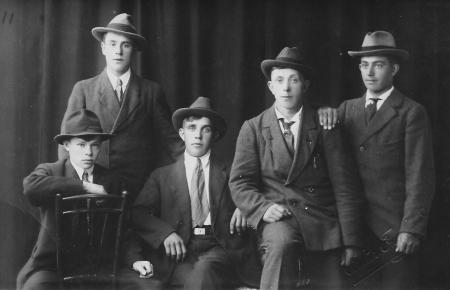 Från vänster: Johan Arvid* Lithén på stolen (1903-1974), Uno Johannes Sabel (1903-1996), Joel August Lithén (1902-1977), Hugo Evald Järv (1898-1978), Emil Valfrid Järv (1902-1923)
