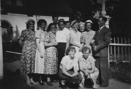 Från vänster: Okänd (kan vara Svea Hjerpe från Stormis), Ines Lithén, Alvina Pellas, Adele Lund, Emilia Lithén, Emmy Lax, Selma Storm, okänd, Eero Storm.