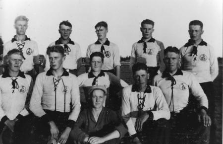 Målvakt: Hugo Lithén, ovanför honom: Gideon Hjerpe, till vänster om Gideon: Gustav V. Lithén.