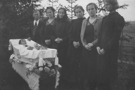 Sörjande från vänster: Far Otto, Oline, mor Anna, och tre av Leos yngre systrar.