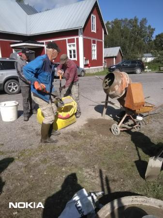 Grunden för nya flaggstången gjuts hösten 2024. Ingvald Hjerpe fyller betongblandaren. Kjell Berts och Håkan Norrgård assisterar.