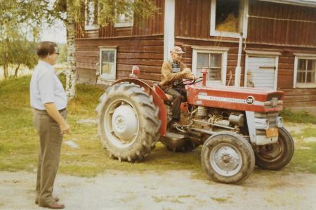 Gunnar på sin Massey Ferguson traktor på brodern Eeros gårdsplan. Svågern Samuel Klemets ser på.