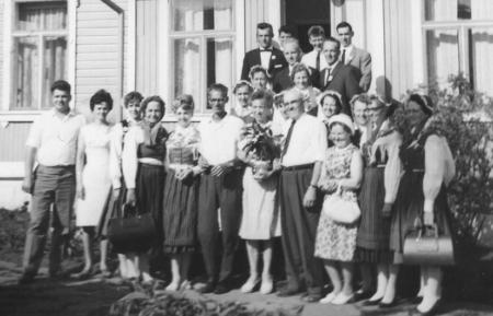 Nere från vänster: Vår busschaufför Nisse Lindevall och hustrun Marita Lindevall., Kerstin Storm, Oline Hjerpe, Viola Lithén, värdhusvärden, Inga Håkans, Emilia Lithén (ovanför), värdinnan (nedanför), okänd skymd, Georg Pellas, Ines Lithén, Lindvi Håkans?, Alvina Pellas, Lisbeth Österåker, Inger Lithén, okänd.